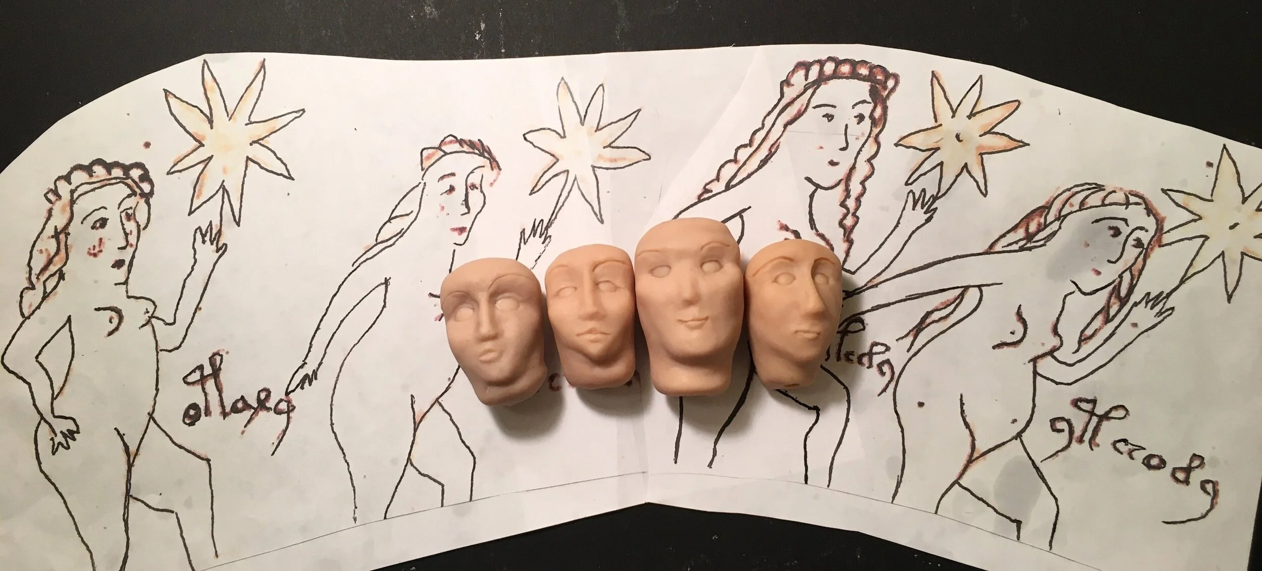 This time I’m continuing to model all four of the nymph faces in polymer clay, making three-dimensional versions based on the original Voynich Manuscript drawings from folio 73r. As I explained in the last video, these polymer clay models are not the final sculpture; I am using them to make porcelain molds, so they do not yet have the detail of eyes, hair or crowns/headwear.